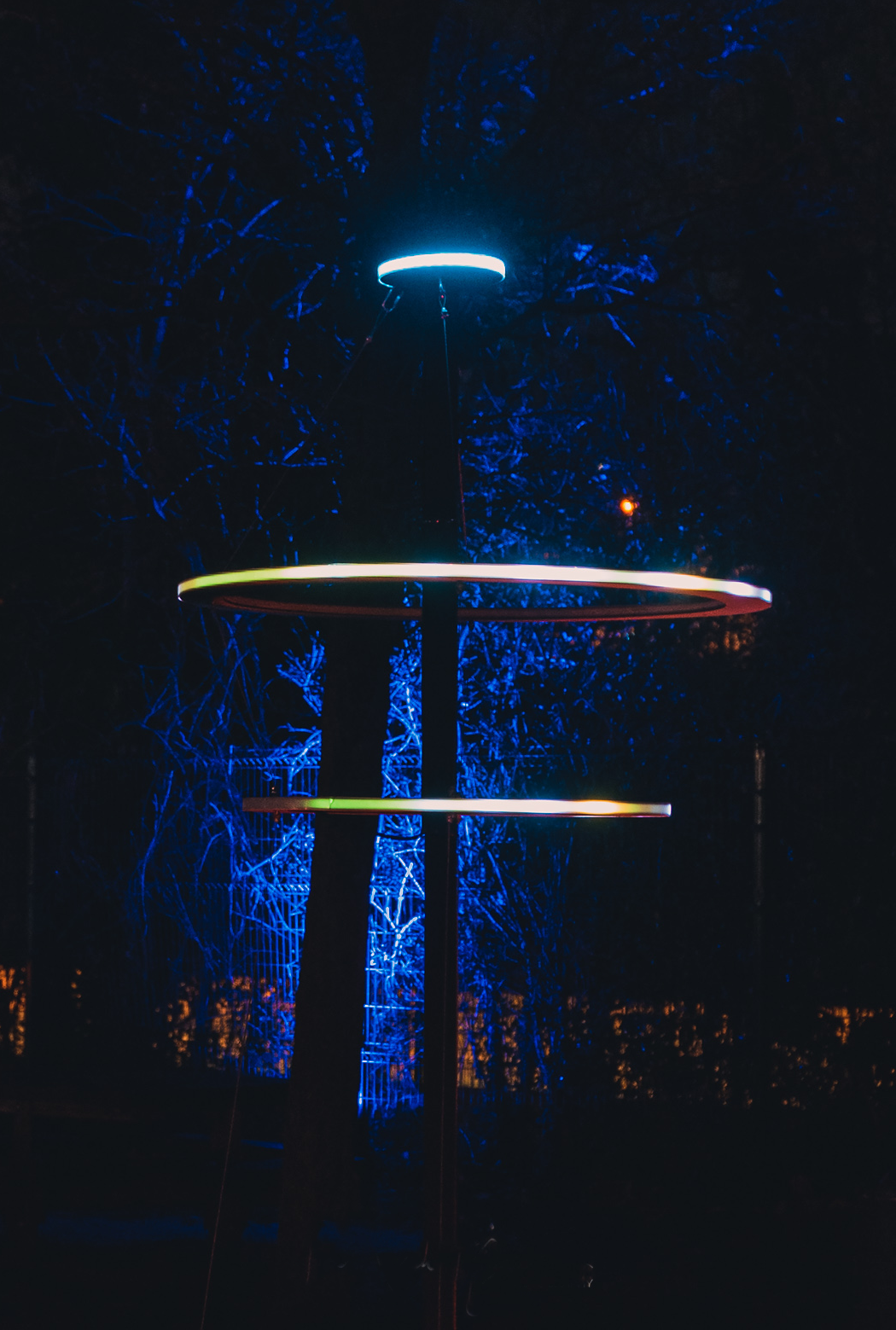 A light installation created for Bike for Brussels (mobility.brussels) representing the growing amount of cyclists over the past four years, presented at Bright Brussels. We created 45 LED rings representing data points, containing about 8000 individually adressed lights, allowing the audience to explore the spread of cyclists throughout 12 counting points in Brussels over the seasons. Any live counted cyclist during the event sparked a change in the soundscape and a visual effect on the installation. We proudly witnessed the wonder and discovery of the audience during the festival.